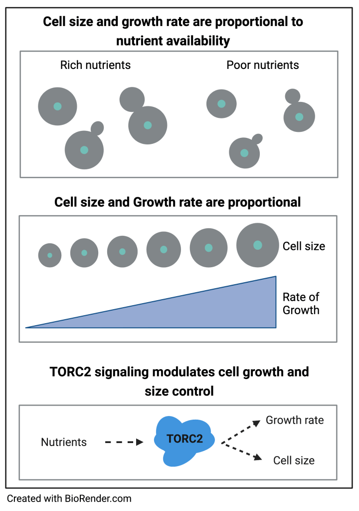 Observations reaching back over 60 years suggest that control of cell growth and cell size are closely linked. For example, growth rate is proportional to nutrient availability, cell size is proportional to growth rate, and growth rate is proportional to cell size. These relationships appear to hold across all orders of life, which suggest that they reflect fundamental principles, yet the underlying mechanisms have remained elusive. We discovered that signals arising from a conserved TORC2 signaling network enforce proportional relationships between nutrient availability, cell growth, and cell size. Our work suggests a model in which TORC2-dependent signals that set growth rate also set the threshold amount of growth required for cell cycle progression, which would provide a simple mechanistic explanation for proportional relationships between cell size and growth rate. We are currently searching for the upstream signals that control the TORC2 network as well as the signaling outputs of the network that influence cell growth and size.