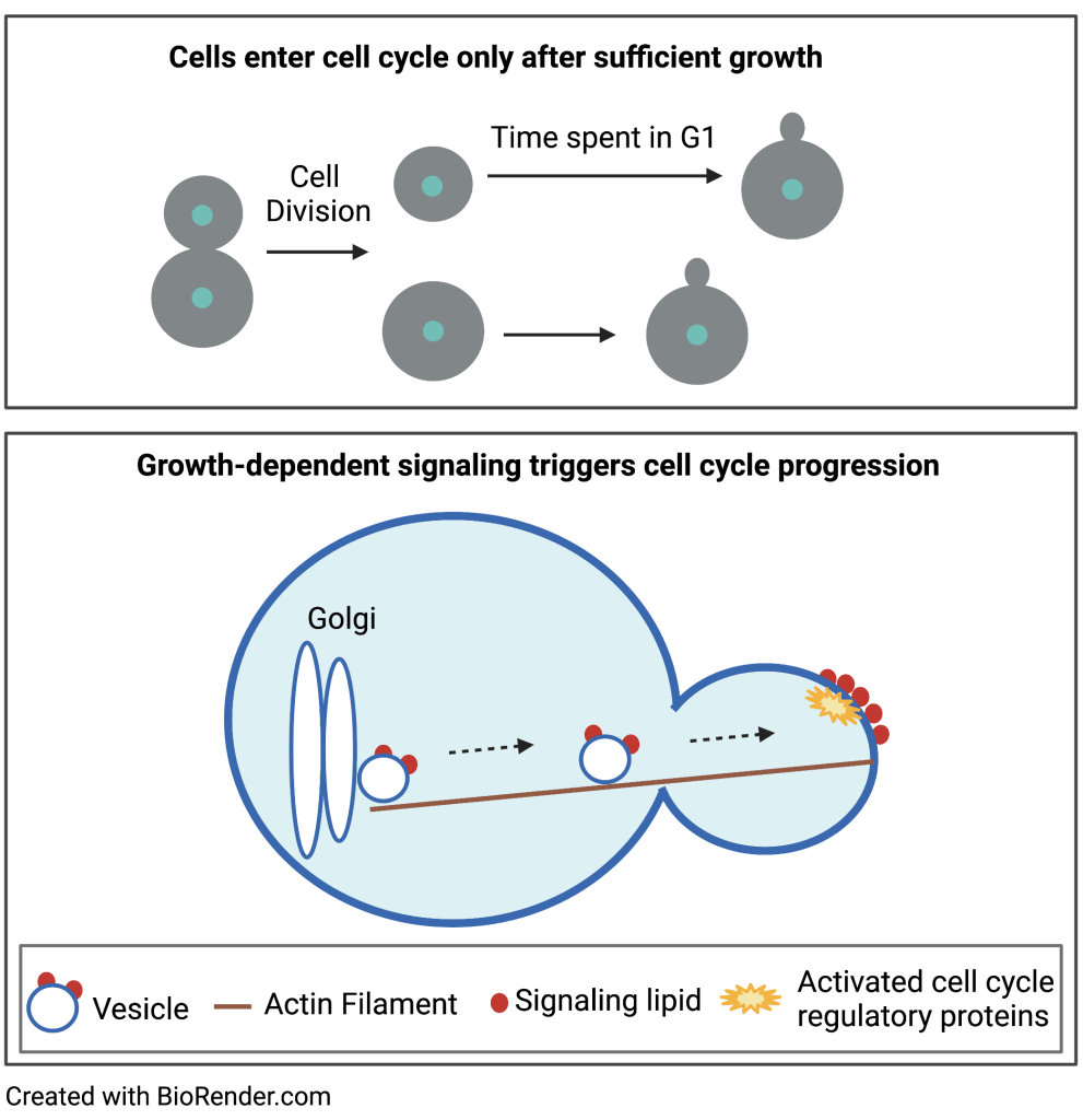In all cells, key cell cycle transitions occur only when sufficient growth has occurred, which ensures that cells maintain a constant size. Thus, cells must convert growth into a proportional signal that triggers cell cycle progression when it reaches a threshold. The mechanisms by which cell growth is measured have remained deeply mysterious. Our recent work suggests that vesicles that drive plasma membrane growth deliver signaling lipids to the growing membrane, which bind and activate conserved signaling proteins to generate a signal that is proportional to the extent of growth. We further discovered signaling networks that could read the growth-dependent signal and trigger cell cycle progression when it reaches a threshold. Growth-dependent signaling suggests a simple and broadly applicable solution to control of cell growth and size. We are currently testing key hypotheses arising from these discoveries, while also carrying out mechanistic analysis to define the signaling networks that control cell growth and size.